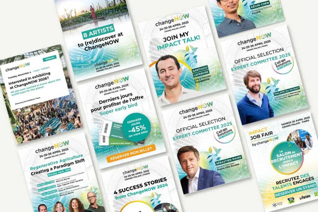 Depuis 2019, j’accompagne ChangeNOW en tant que graphiste freelance. En étroite collaboration avec l’équipe communication et marketing, je conçois et décline une large variété de supports : rapports annuels, programmes print distribués sur l’événement, stands et signalétique, insertions presse, bannières pour les réseaux sociaux, newsletters, présentations et slides, ainsi que divers supports pour les opérations marketing.